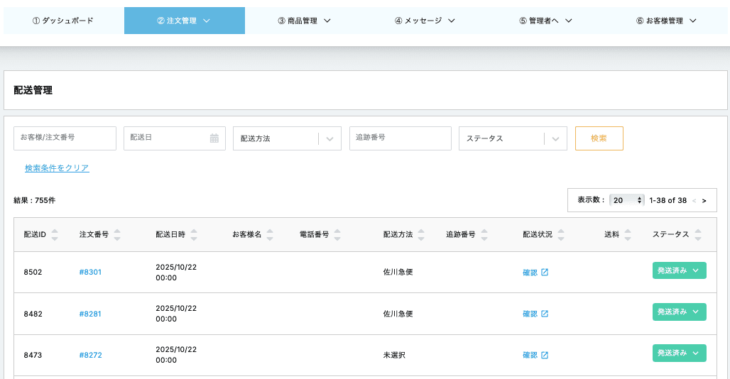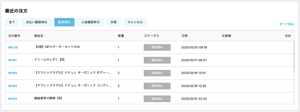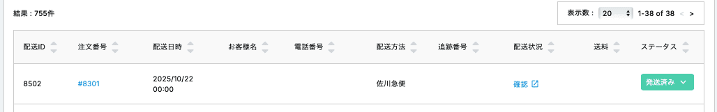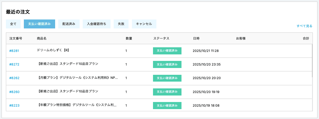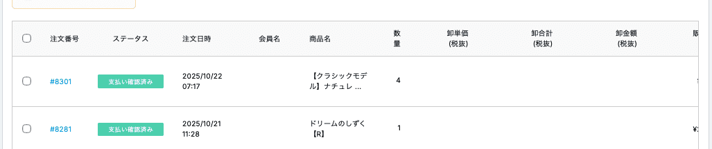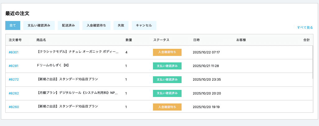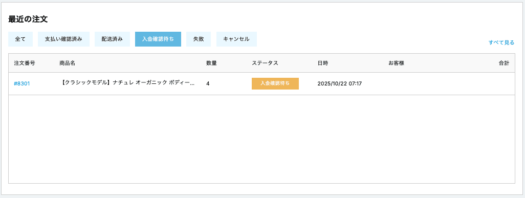 ステータスが入金確認待ちとなり対象の注文を表示します。
