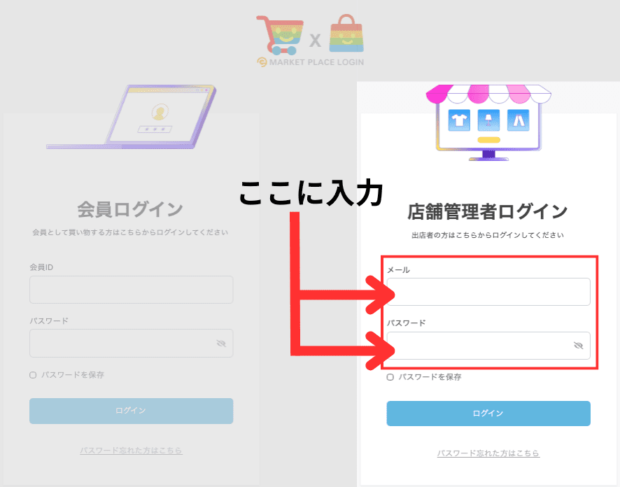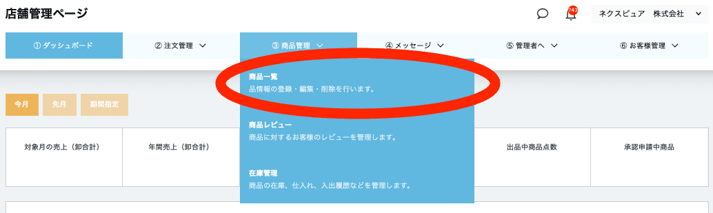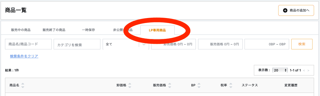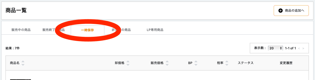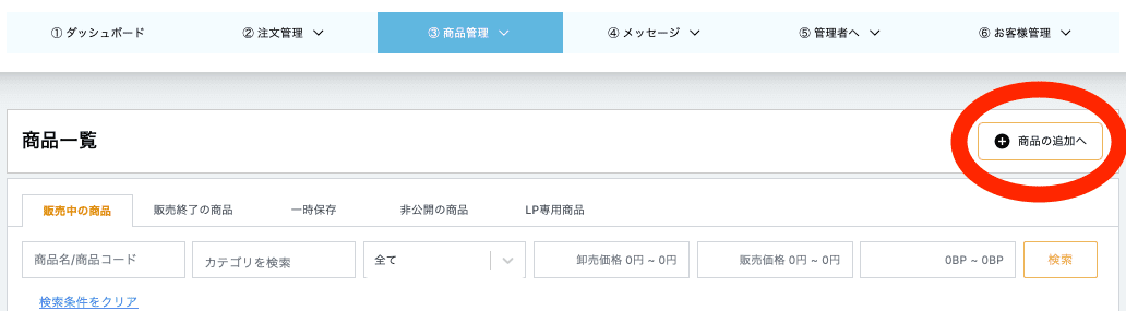 商品登録を行うには『③商品管理』タブから行い、赤丸の『+商品の追加へ』をクリックすることで