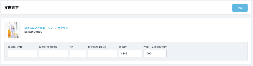 在庫数の数値を変更し、作業が終わったら右上の保存を押します。