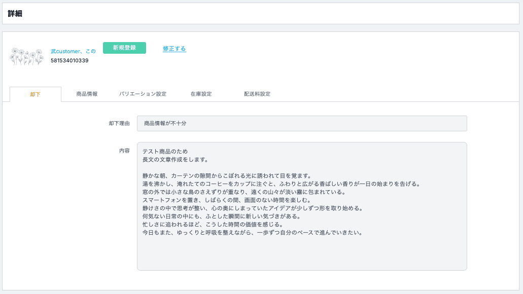 商品情報のどの部分が却下となっているのか却下理由と共に